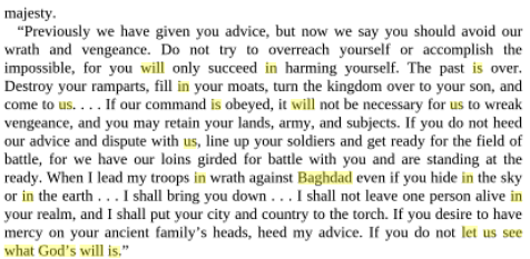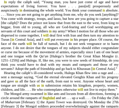 This is a translated History and letters between the leader of the Kahn’s (Hulegu) and the Caliph of Bagdad right before the Kahns utterly destroyed Bagdhad in the 13th century (the year ~1258).